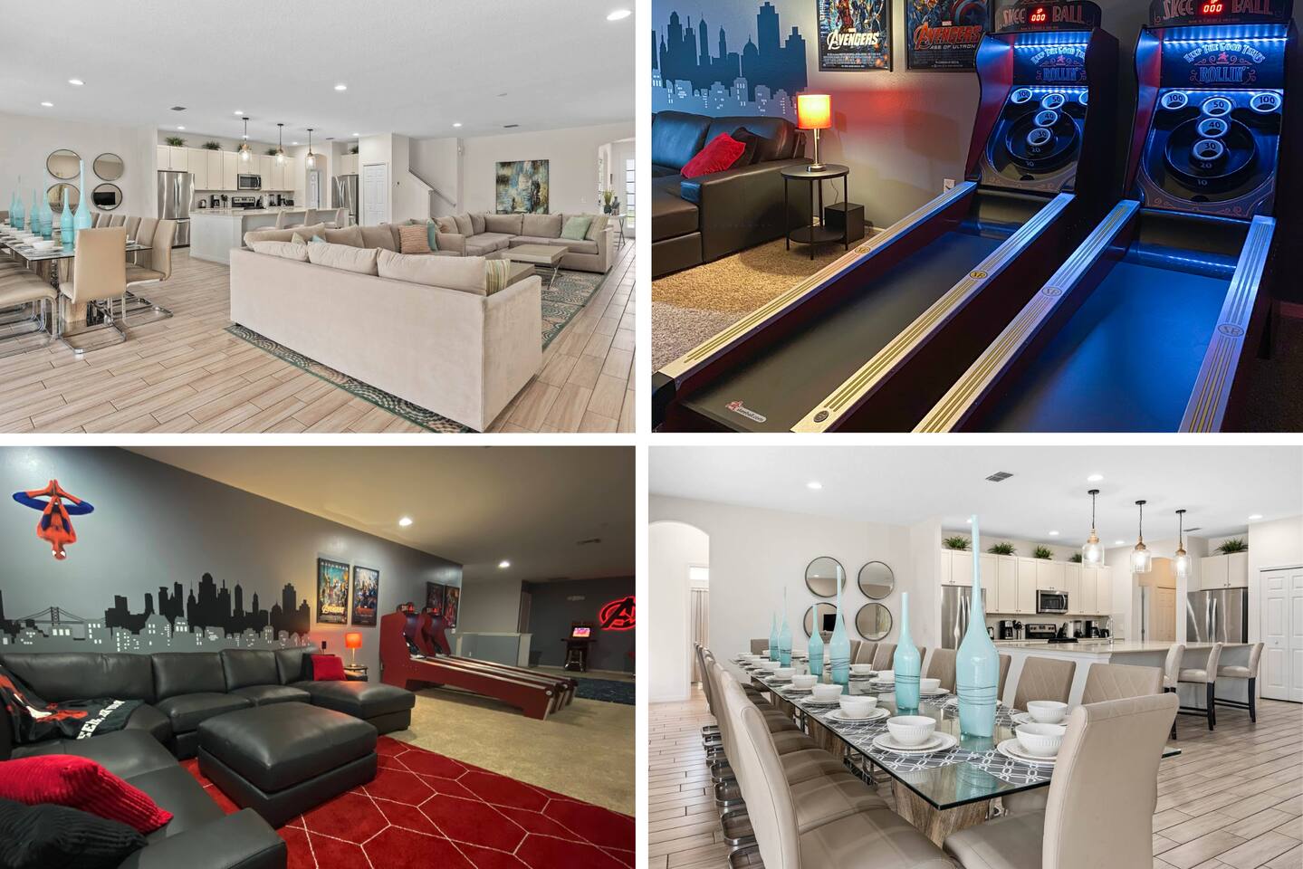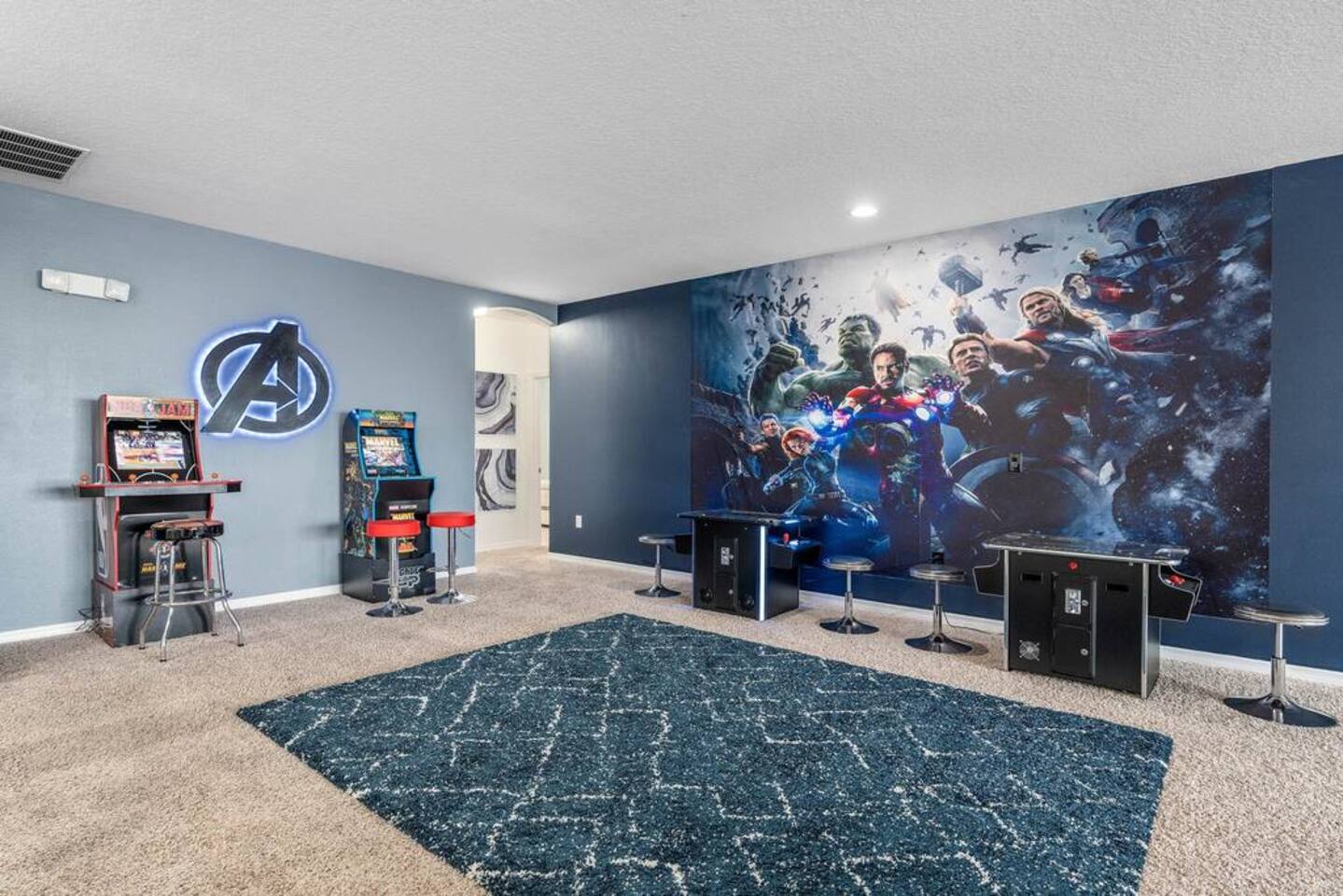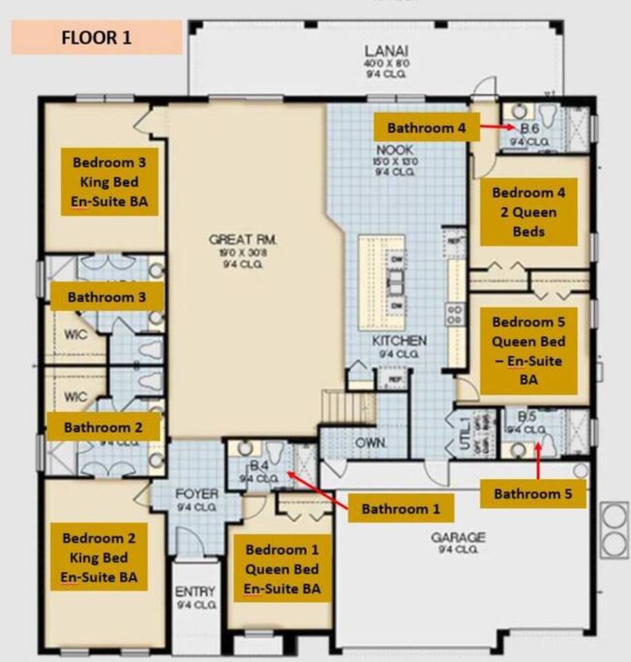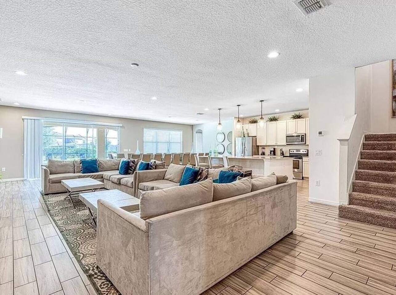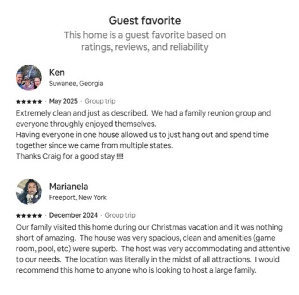 ⭑Bedroom 1 – Floor 1:⭑ ✔ A peaceful queen suite with cozy linens and room-darkening shades ✔ Private en-suite bathroom ⭑Bedroom 2 – Floor 1:⭑ ✔ Elegant King Master Suite with en-suite bathroom ✔ Includes Pack ’n Play crib ⭑Bedroom 3 – Floor 1:⭑ ✔ Second main-floor master with king bed and plush bedding ✔ Private en-suite bathroom and 4K Smart TV ⭑Bedroom 4 – Floor 1:⭑ ✔ Spacious room with two queen beds and private bathroom ✔ Stylish design with plenty of space to unwind ⭑Bedroom 5 – Floor 1:⭑ ✔ Queen bed in a warm and calming retreat ✔ Private en-suite bathroom and welcoming décor ⭑Bedroom 6 – Floor 2:⭑ ✔ King suite with private bathroom and walk-in closet ✔ Ideal for extended stays with extra storage ⭑Bedroom 7 – Floor 2:⭑ ✔ Third Master Suite with king bed and private en-suite ✔ Room-darkening shades for restful nights ⭑Bedroom 8 – Floor 2:⭑ ✔ Full bed with shared Jack & Jill bathroom ✔ Great for solo travelers or teens ⭑Bedroom 9 – Floor 2:⭑ ✔ Queen bed with soft linens and shared bathroom access ✔ Plenty of closet space and natural light ⭑Bedroom 10 – Floor 2:⭑ ✔ Quiet queen room with shared bathroom ✔ Cozy vibe, perfect for unwinding after a busy day ⭑Bedroom 11 – Floor 2:⭑ ✔ Bright and modern king room with shared bathroom ✔ Soft bedding and a homey atmosphere ⭑Bedroom 12 – Floor 2:⭑ ✔ Two queen beds — great for groups or families ✔ Shared bathroom and lots of space to spread out ⭑Bedroom 13 – Floor 2:⭑ ✔ Two queen beds with a group-friendly layout ✔ Comfortable and convenient with shared bathroom ⭑Bedroom 14 – Floor 2:⭑ ✔ Queen bed with private en-suite bathroom ✔ Peaceful, stylish, and perfect for solo time ⭑Living Room:⭑ ✔ Open-concept gathering space with plush seating ✔ 70” HDTV with surround sound for movie nights ⭑Kitchen and Dining Area:⭑ ✔ Chef’s kitchen with stainless steel appliances, two fridges, and two dishwashers ✔ Expansive island for prep and buffet-style meals ✔ Indoor and outdoor dining areas for group feasts ⭑Bathrooms:⭑ ✔ 11 modern bathrooms stocked with hotel-style toiletries and soft towels ✔ Outdoor shower available for post-pool rinses ⭑Outdoor Space:⭑ ✔ Private screened-in pool and spa (heated year-round on request, for small fee) ✔ Outdoor dining set, loungers, and spacious backyard for relaxing or playing ⭑Additional Amenities:⭑ ✔ Avengers-themed game room with arcade games, skee-ball ✔ 70" 4K Smart TV with plush seating and Dolby Soundbar ✔ Two laundry rooms with washers and dryers for added convenience ⭑Safety and Security:⭑ ✔ Equipped with smoke detectors, carbon monoxide detectors, fire extinguisher, and first aid kit ⭑Entertainment and Connectivity:⭑ ✔ High-speed Wi-Fi and Ethernet throughout ✔ Access to Netflix, Disney+, Hulu, Amazon Prime on all Smart TVs ⭑Heating and Cooling:⭑ ✔ Central air conditioning and heating ✔ Ceiling fans and portable fans for custom comfort ⭑Parking and Facilities:⭑ ✔ Free on-site parking and additional street parking ✔ Self-check-in with secure keypad entry ⭑Services:⭑ ✔ Pool and spa heating available (additional fee) ✔ Full access to Solterra Resort amenities: water slides, gym, tennis courts, and more Your stay at this Solterra villa promises group-friendly luxury, exciting entertainment, and all the comforts of home. Book now and make your Central Florida experience unforgettable! ⭑Conclusion⭑ Whether you're hosting a family reunion, vacationing with friends, or planning a special celebration, this villa offers the perfect space to gather, relax, and make magical memories. Reserve your stay today and discover Solterra living at its best!