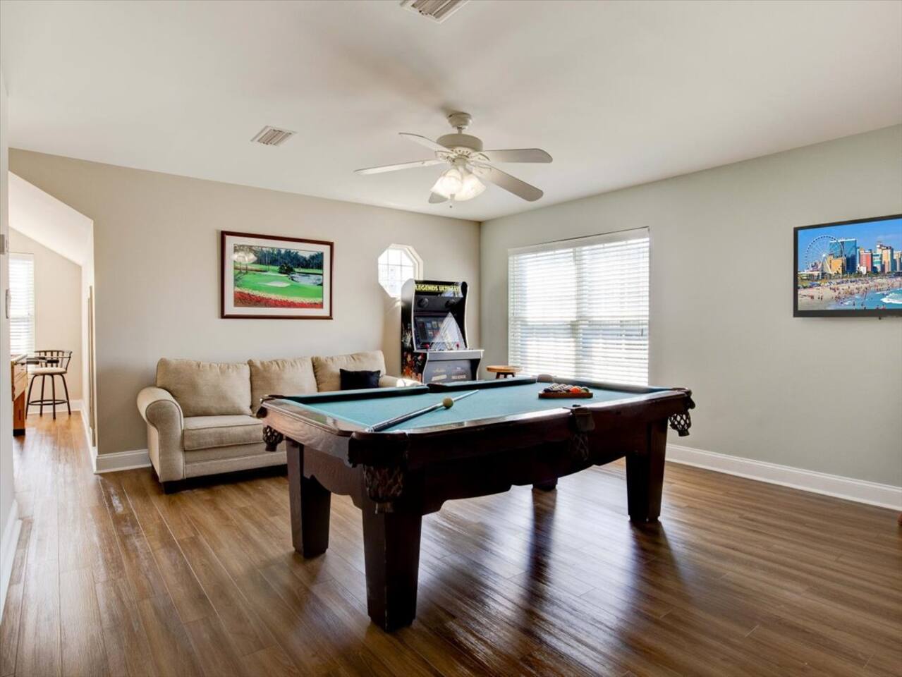 ⭑Master Bedroom:⭑ ✔ Drift off to sleep in a plush king-sized bed as you listen to the gentle ocean breeze. ✔ Step out onto your private deck to enjoy your morning coffee with a view. ✔ Complete with a ceiling fan, Smart HDTV, and en-suite bathroom for ultimate privacy and relaxation. ⭑Second Bedroom:⭑ ✔ Unwind in a cozy king-sized bed perfect for couples or solo travelers. ✔ Stay cool with the ceiling fan and enjoy movie nights on your personal Smart HDTV. ✔ Your private en-suite bathroom makes mornings a breeze. ⭑Third Bedroom:⭑ ✔ Relax in the comfort of a queen-sized bed with soft, fresh linens. ✔ Watch your favorite shows on the Smart HDTV before settling in for the night. ✔ The en-suite bathroom ensures convenience and privacy. ⭑Fourth Bedroom:⭑ ✔ Ideal for kids or friends, this room offers two twin beds that are both fun and functional. ✔ Ceiling fan and Smart HDTV add to the comfort of this cozy space. ✔ En-suite bathroom ensures everyone has their own space to get ready. ⭑Fifth Bedroom:⭑ ✔ A queen-sized bed, calming decor, and premium bedding make this room a serene retreat. ✔ Curl up with a good book or binge-watch your favorite shows on the Smart HDTV. ✔ Private en-suite bathroom adds an extra touch of luxury. ⭑Sixth Bedroom:⭑ ✔ Perfect for larger groups, this room features two queen-sized beds with extra pillows and blankets. ✔ Enjoy your downtime with a personal Smart HDTV and refreshing ceiling fan. ✔ En-suite bathroom means no need to wait in line during your busy mornings. ⭑Living Room:⭑ ✔ Gather with loved ones in a spacious, sunlit living area featuring plush seating. ✔ Watch movies, stream shows, or connect your devices to the 55-inch HDTV equipped with Netflix, Hulu, and more. ✔ Create the perfect ambiance with a Bluetooth sound system for music or movie nights. ⭑Kitchen and Dining Area:⭑ ✔ The heart of the home—a fully stocked kitchen with everything from modern appliances to baking essentials. ✔ Host memorable meals around the large dining table, designed to bring everyone together. ✔ Enjoy a morning coffee or evening wine with specialty glassware and a coffee maker at your service. ⭑Bathrooms:⭑ ✔ With 6.5 bathrooms, every guest has a space to refresh and unwind. ✔ Luxurious touches include fresh towels, premium shampoo, conditioner, and body wash in every bathroom. ✔ Rinse off the sand after a beach day with the convenient outdoor shower. ⭑Outdoor Space:⭑ ✔ Bask in the sun by your private pool, or lounge on the expansive sundeck with a good book. ✔ Enjoy evening BBQs and alfresco dining under the stars in the outdoor dining area. ✔ Multiple furnished porches and balconies let you take in the warm South Carolina breeze from every angle. ⭑Additional Amenities:⭑ ✔ Dive into fun with a game room featuring a pool table, arcade games, foosball, and a 50" 4K HDTV. ✔ Kids will love the themed playroom with toys, books, and games, ensuring fun for all ages. ✔ A mini-golf setup adds a playful touch to your stay. ⭑Safety and Security:⭑ ✔ Peace of mind with a smoke alarm, carbon monoxide alarm, fire extinguisher, and first aid kit. ⭑Entertainment and Connectivity:⭑ ✔ Stay connected with high-speed WiFi and a dedicated workspace with a private door for remote work. ⭑Heating and Cooling:⭑ ✔ Enjoy year-round comfort with central air conditioning, ceiling fans, portable fans, and heating. ⭑Parking and Facilities:⭑ ✔ Ample free parking with up to four spaces and a private entrance for added convenience. ⭑Services:⭑ ✔ Self check-in with keypad access makes arrival seamless. ✔ Long-term stays and luggage drop-off are available for added flexibility. ⭑Conclusion:⭑ Your stay at this North Myrtle Beach house promises luxurious comfort, family-friendly fun, and an unforgettable beachside experience. Whether you’re soaking up the sun by the pool, enjoying a game night in the arcade room, or exploring nearby attractions like Barefoot Landing, every moment will be filled with joy and relaxation. We’re excited to host your next adventure—reserve your stay today and experience the perfect combination of relaxation, convenience, and fun!