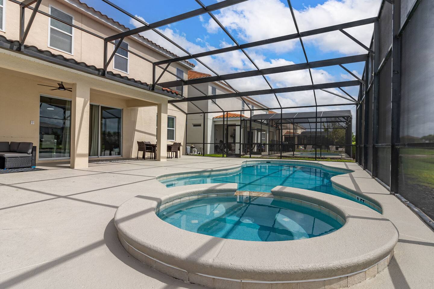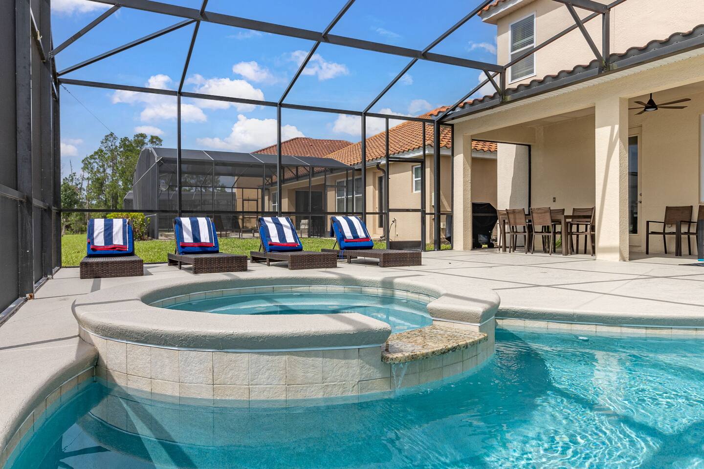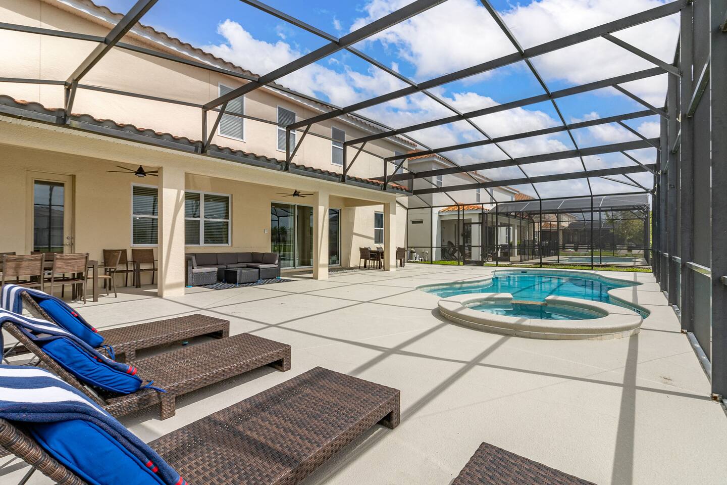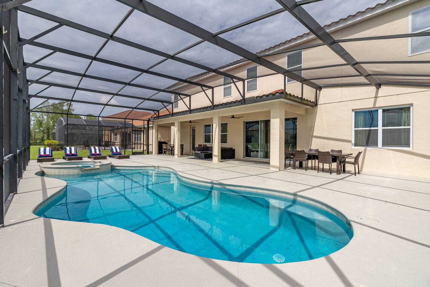 Guests have full access to this spacious and luxurious villa, including the following amenities: - **Private Pool/Spa:** Enjoy a relaxing dip in your screened private pool or unwind in the hot tub, perfect for both day and night use. - **Game Room:** Dive into fun with arcade games, a Wii Switch gaming station, and a tall gaming table for card games. Perfect for all ages! - **Home Theater:** Experience movie nights in style with a 5.1 Dolby Surround Sound system and a 90" Smart 4K TV. - **Entire Home:** Enjoy complete privacy and comfort throughout the 6,200 sq/ft villa, accommodating up to 32 guests. - **Outdoor Spaces:** Make the most of Florida’s sunshine with access to the patio, outdoor dining area, backyard, and sun loungers. - **Solterra Resort Amenities:** Guests can also enjoy full access to all Solterra Resort amenities, including the gym, communal pool, playground, and more, offering additional options for leisure and recreation during your stay. With ample space and numerous amenities, our villa is designed to offer a comfortable, convenient, and memorable experience for all our guests.