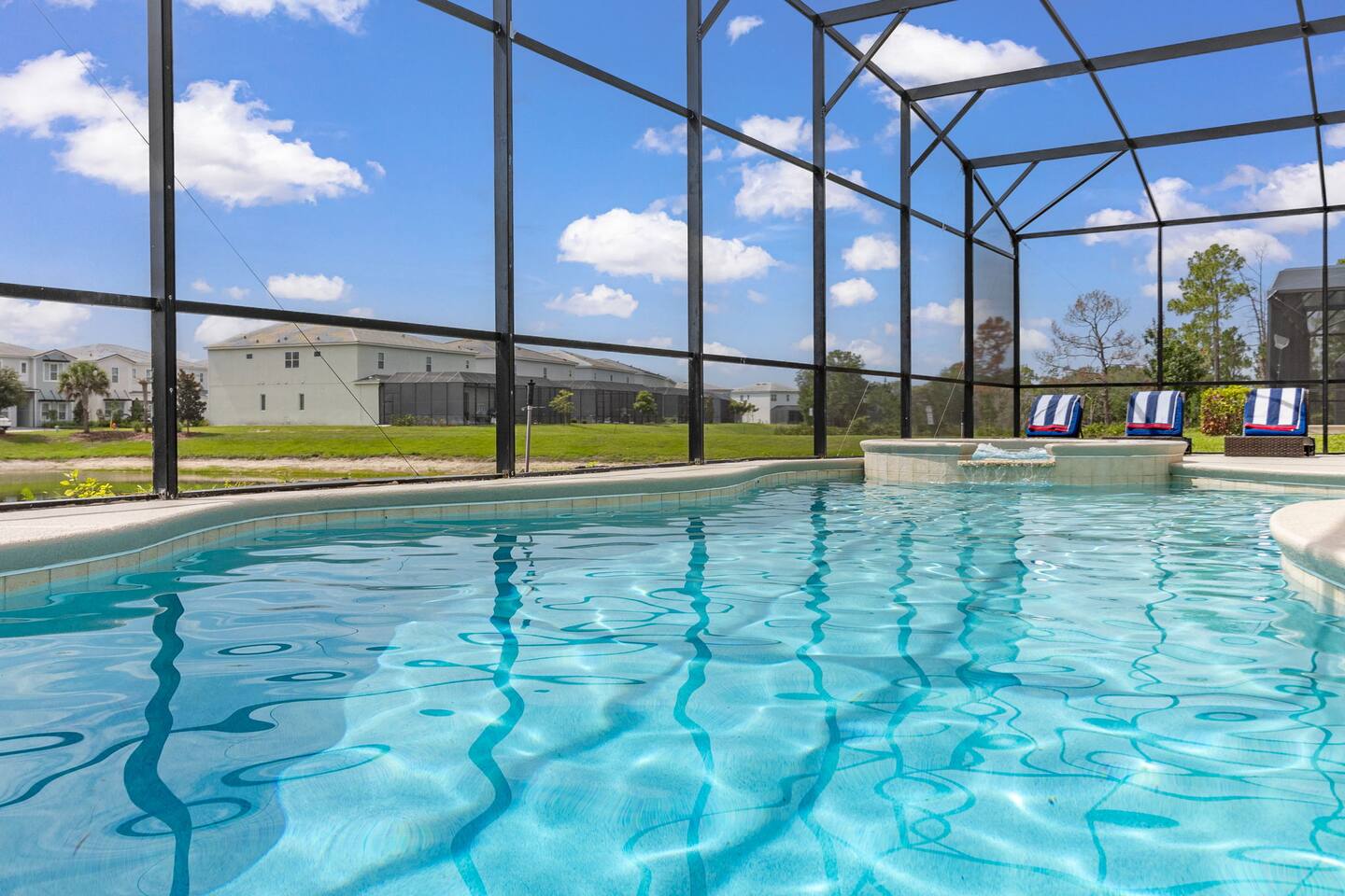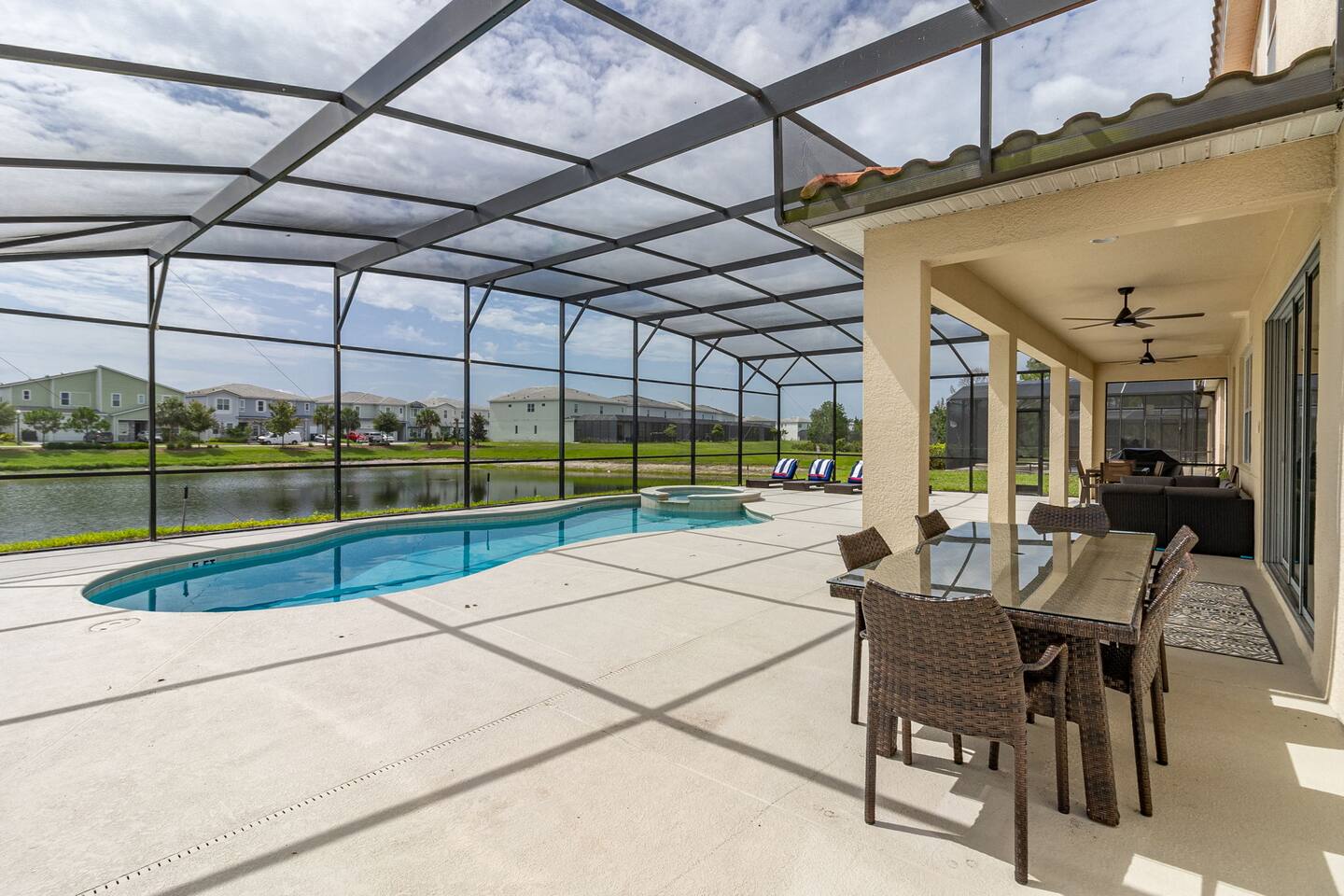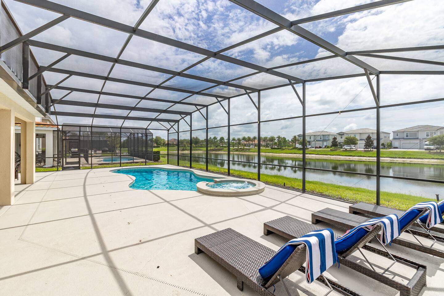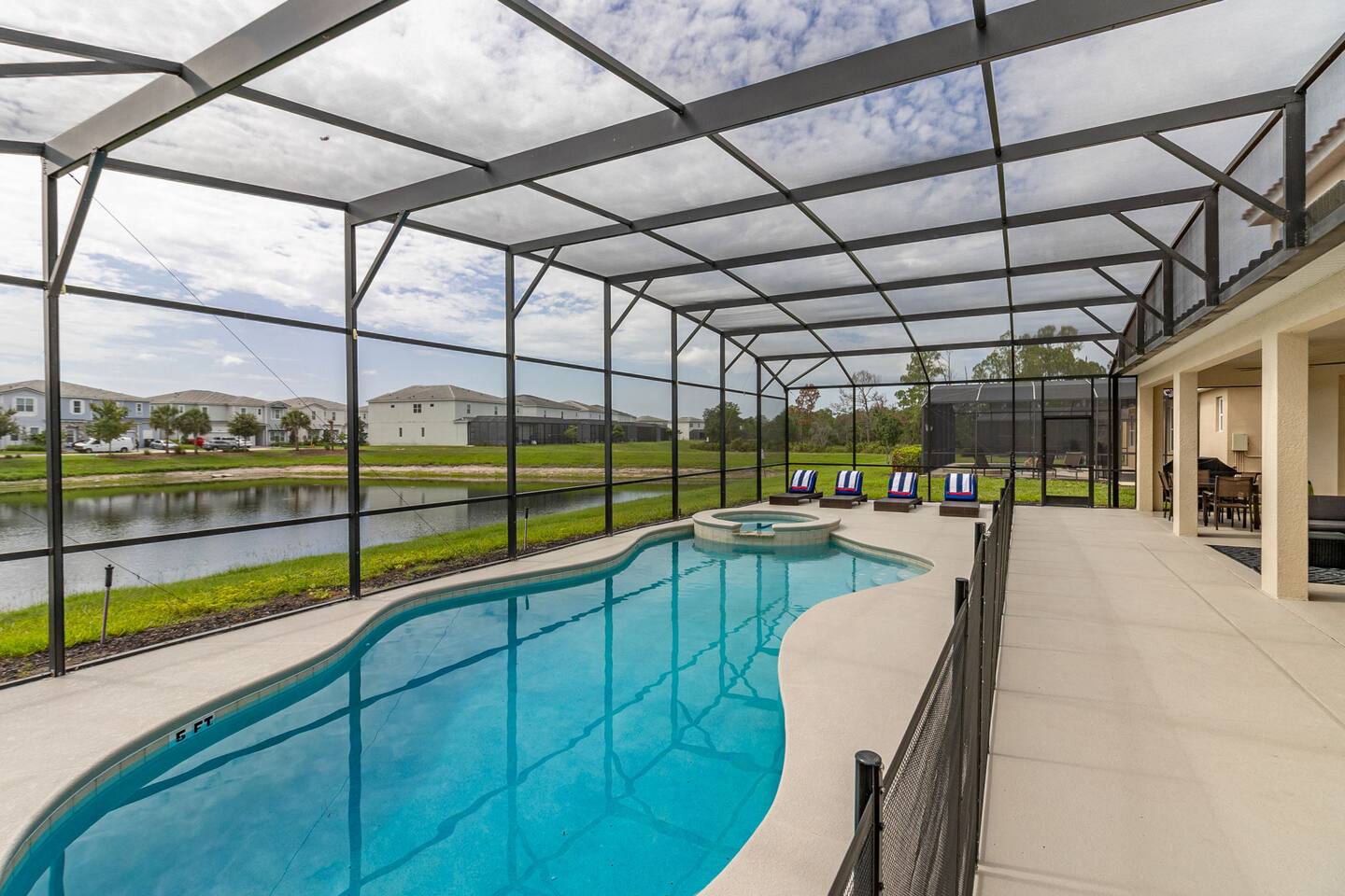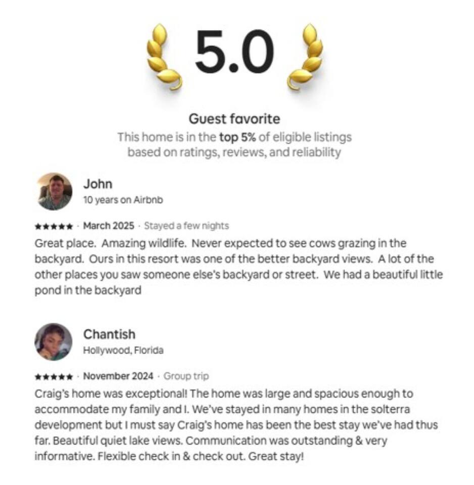 Guests have full access to this spacious and luxurious villa, including the following amenities: - **Private Pool/Spa:** Enjoy a relaxing dip in your screened private pool or unwind in the hot tub, perfect for both day and night use. - **Game Room:** Dive into fun with arcade games, a Wii Switch gaming station, and a tall gaming table for card games. Perfect for all ages! - **Home Theater:** Experience movie nights in style with a 5.1 Dolby Surround Sound system and a 90" Smart 4K TV. - **Entire Home:** Enjoy complete privacy and comfort throughout the 6,200 sq/ft villa, accommodating up to 32 guests. - **Outdoor Spaces:** Make the most of Florida’s sunshine with access to the patio, outdoor dining area, backyard, and sun loungers. - **Solterra Resort Amenities:** Guests can also enjoy full access to all Solterra Resort amenities, including the gym, communal pool, playground, and more, offering additional options for leisure and recreation during your stay. With ample space and numerous amenities, our villa is designed to offer a comfortable, convenient, and memorable experience for all our guests.