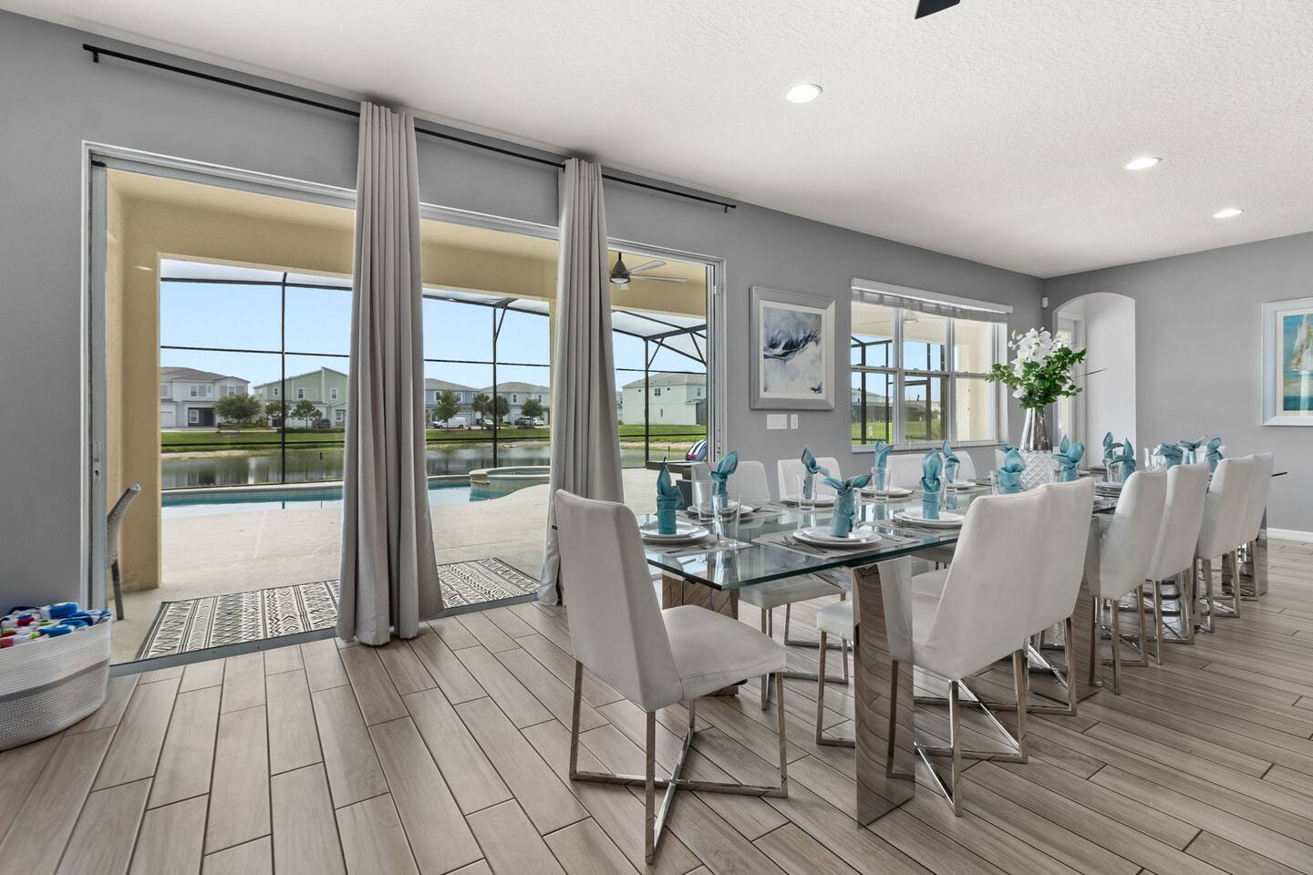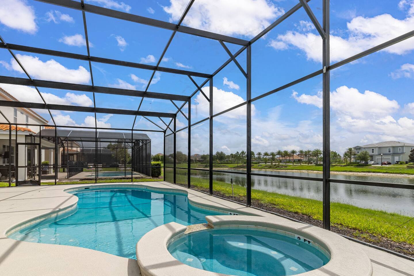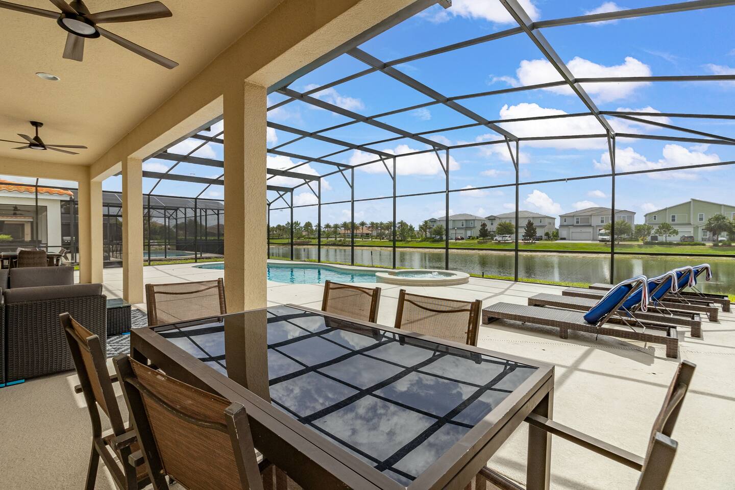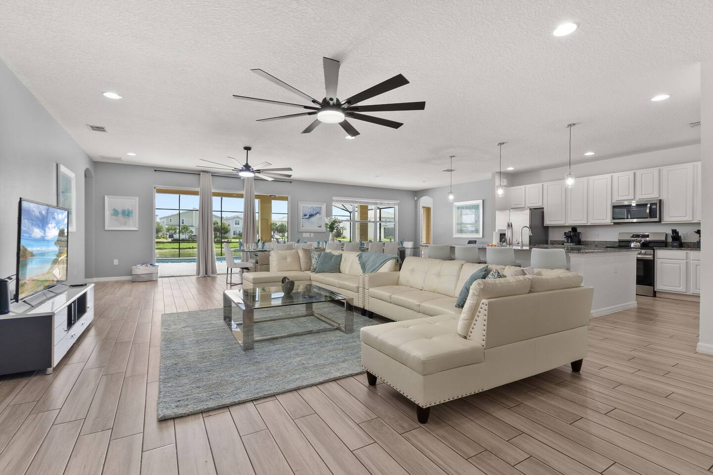 Guests have full access to this spacious and luxurious villa, including the following amenities: - **Private Pool/Spa:** Enjoy a relaxing dip in your screened private pool or unwind in the hot tub, perfect for both day and night use. - **Game Room:** Dive into fun with arcade games, a Wii Switch gaming station, and a tall gaming table for card games. Perfect for all ages! - **Home Theater:** Experience movie nights in style with a 5.1 Dolby Surround Sound system and a 90" Smart 4K TV. - **Entire Home:** Enjoy complete privacy and comfort throughout the 6,200 sq/ft villa, accommodating up to 32 guests. - **Outdoor Spaces:** Make the most of Florida’s sunshine with access to the patio, outdoor dining area, backyard, and sun loungers. - **Solterra Resort Amenities:** Guests can also enjoy full access to all Solterra Resort amenities, including the gym, communal pool, playground, and more, offering additional options for leisure and recreation during your stay. With ample space and numerous amenities, our villa is designed to offer a comfortable, convenient, and memorable experience for all our guests.