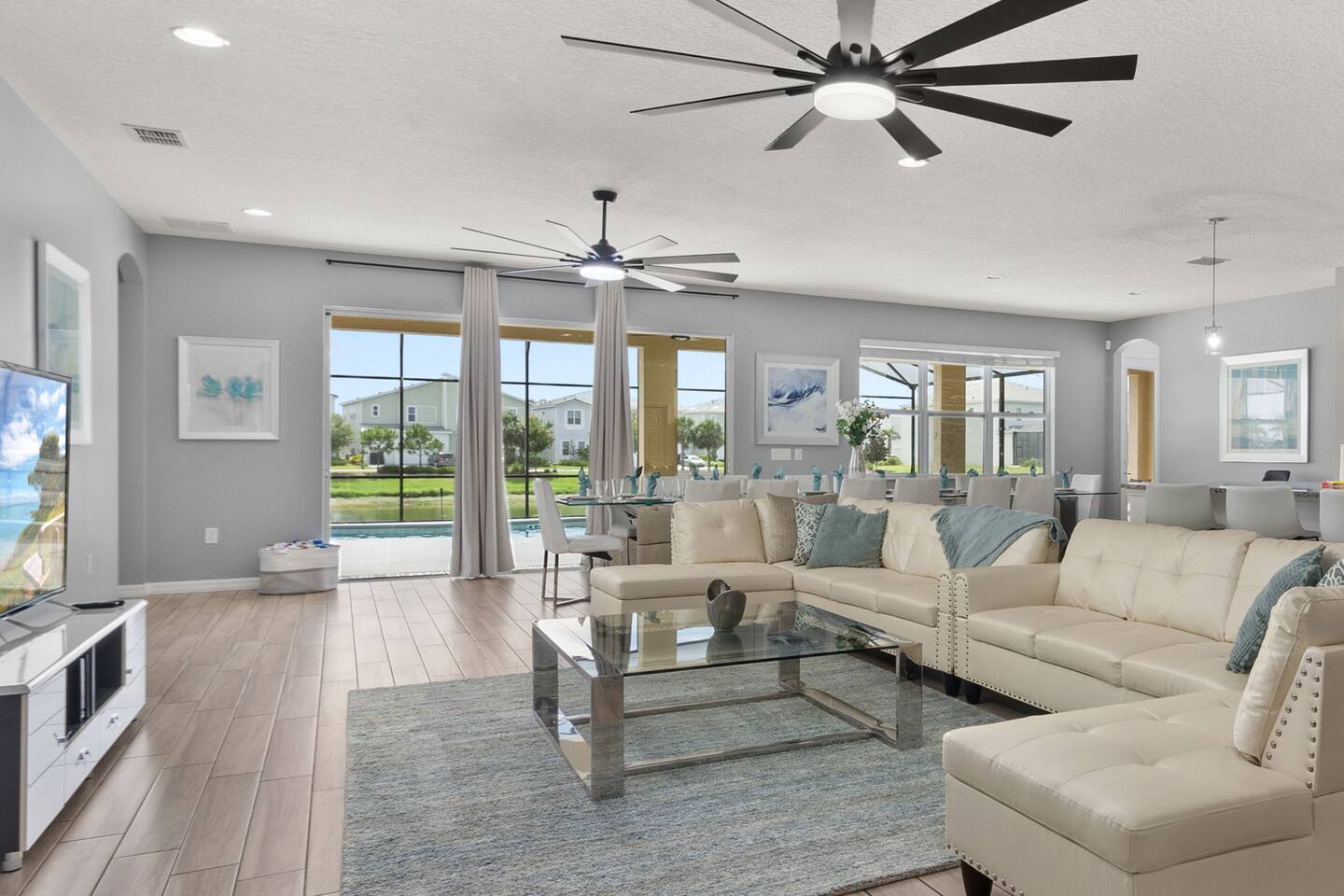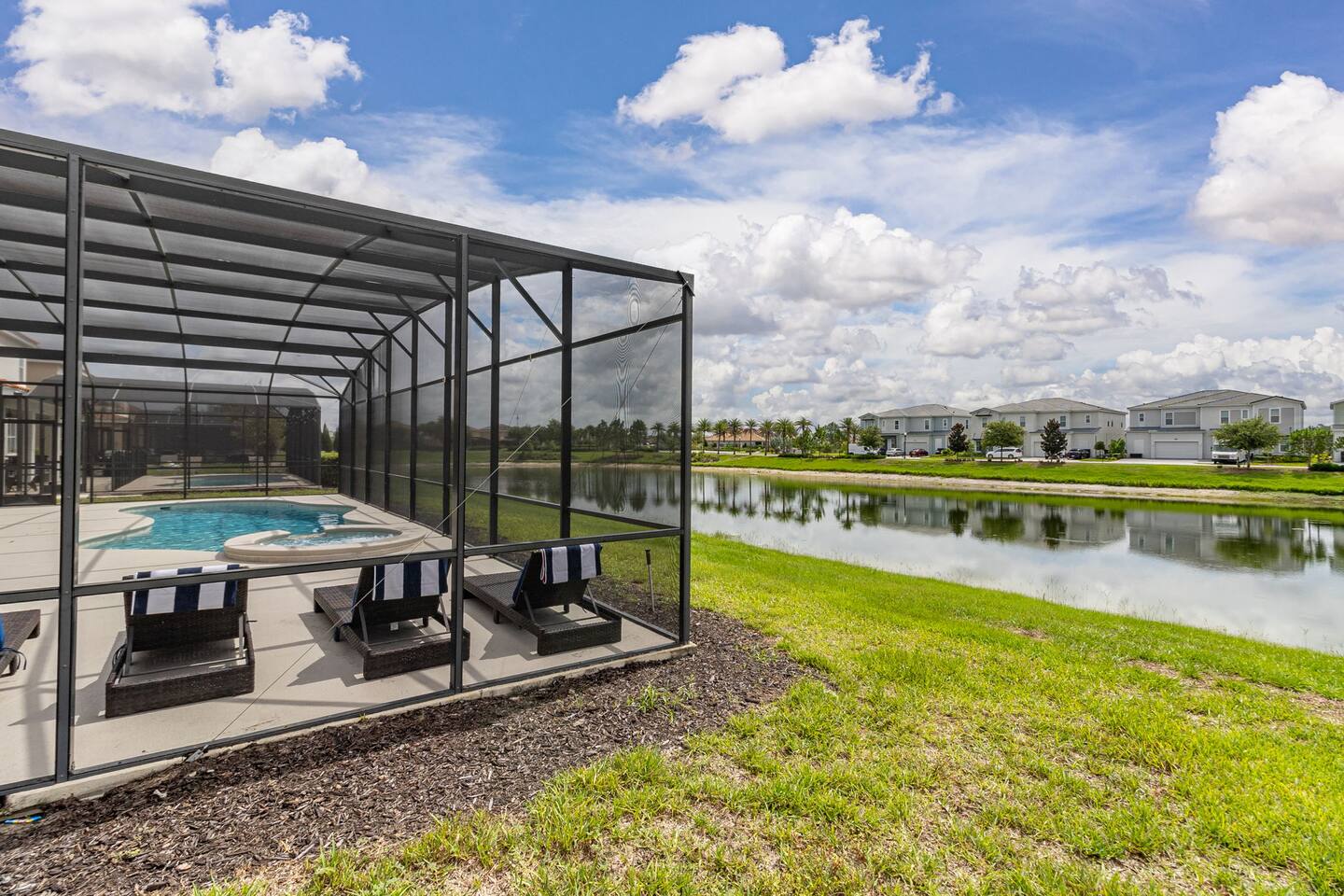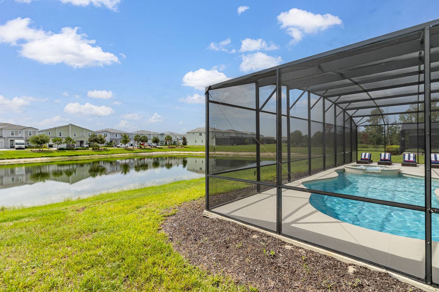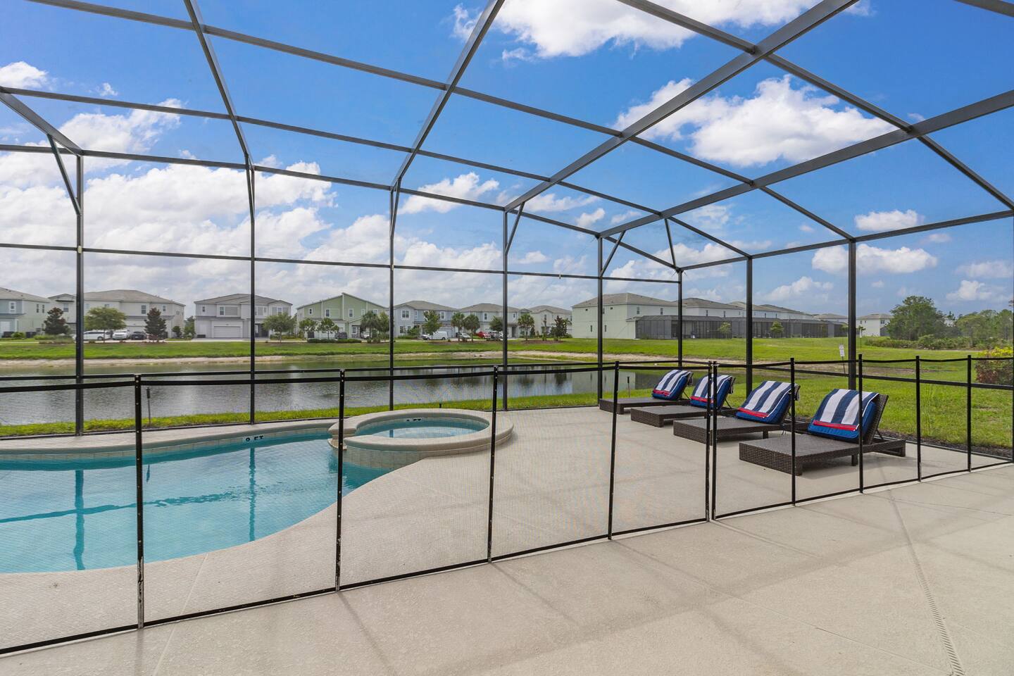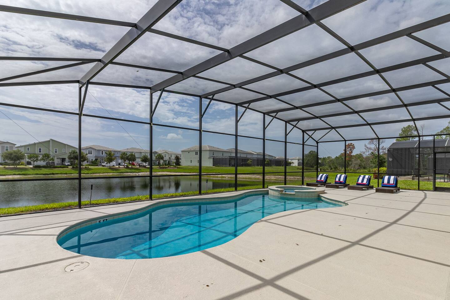 Guests have full access to this spacious and luxurious villa, including the following amenities: - **Private Pool/Spa:** Enjoy a relaxing dip in your screened private pool or unwind in the hot tub, perfect for both day and night use. - **Game Room:** Dive into fun with arcade games, a Wii Switch gaming station, and a tall gaming table for card games. Perfect for all ages! - **Home Theater:** Experience movie nights in style with a 5.1 Dolby Surround Sound system and a 90" Smart 4K TV. - **Entire Home:** Enjoy complete privacy and comfort throughout the 6,200 sq/ft villa, accommodating up to 32 guests. - **Outdoor Spaces:** Make the most of Florida’s sunshine with access to the patio, outdoor dining area, backyard, and sun loungers. - **Solterra Resort Amenities:** Guests can also enjoy full access to all Solterra Resort amenities, including the gym, communal pool, playground, and more, offering additional options for leisure and recreation during your stay. With ample space and numerous amenities, our villa is designed to offer a comfortable, convenient, and memorable experience for all our guests.