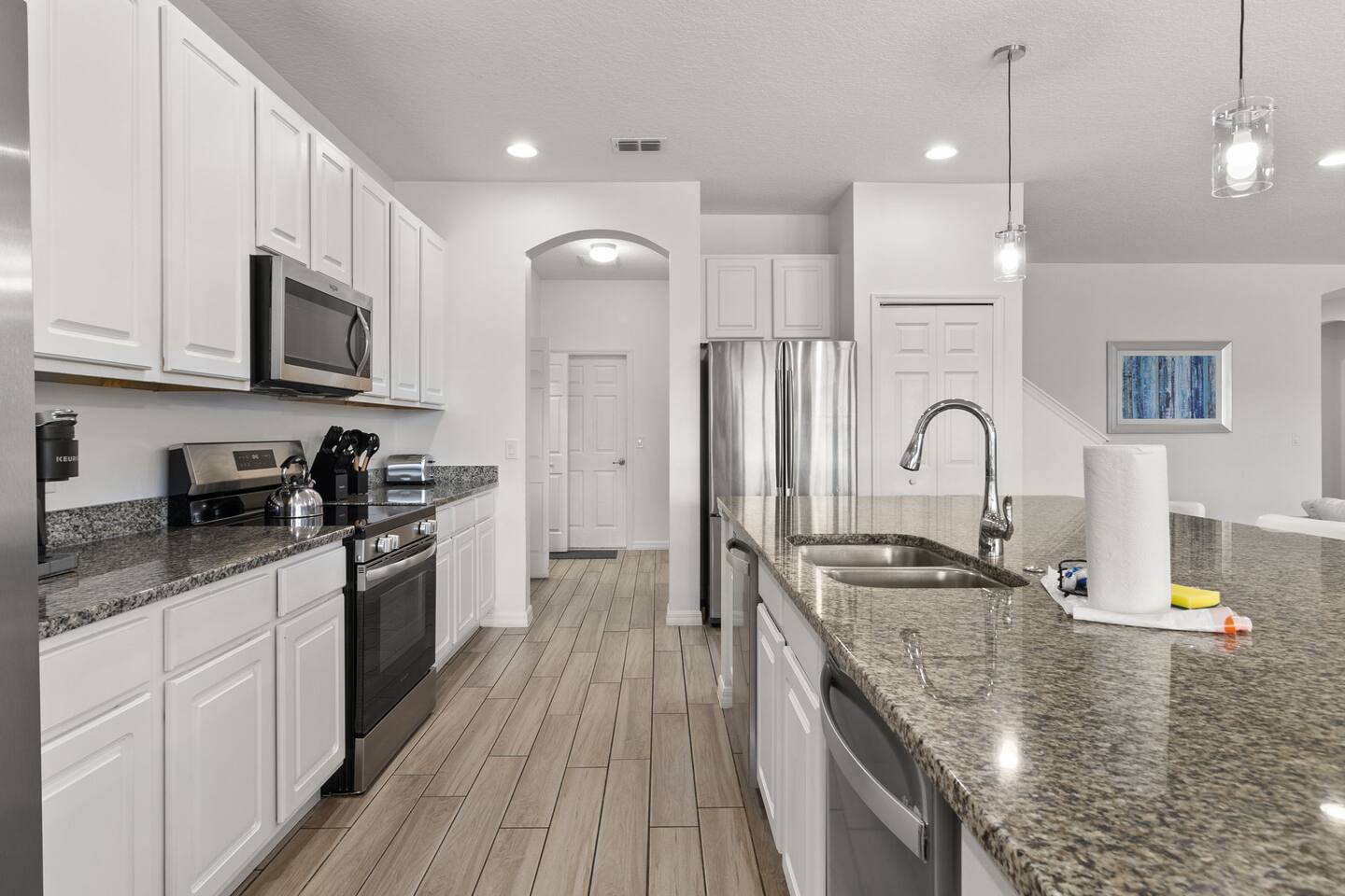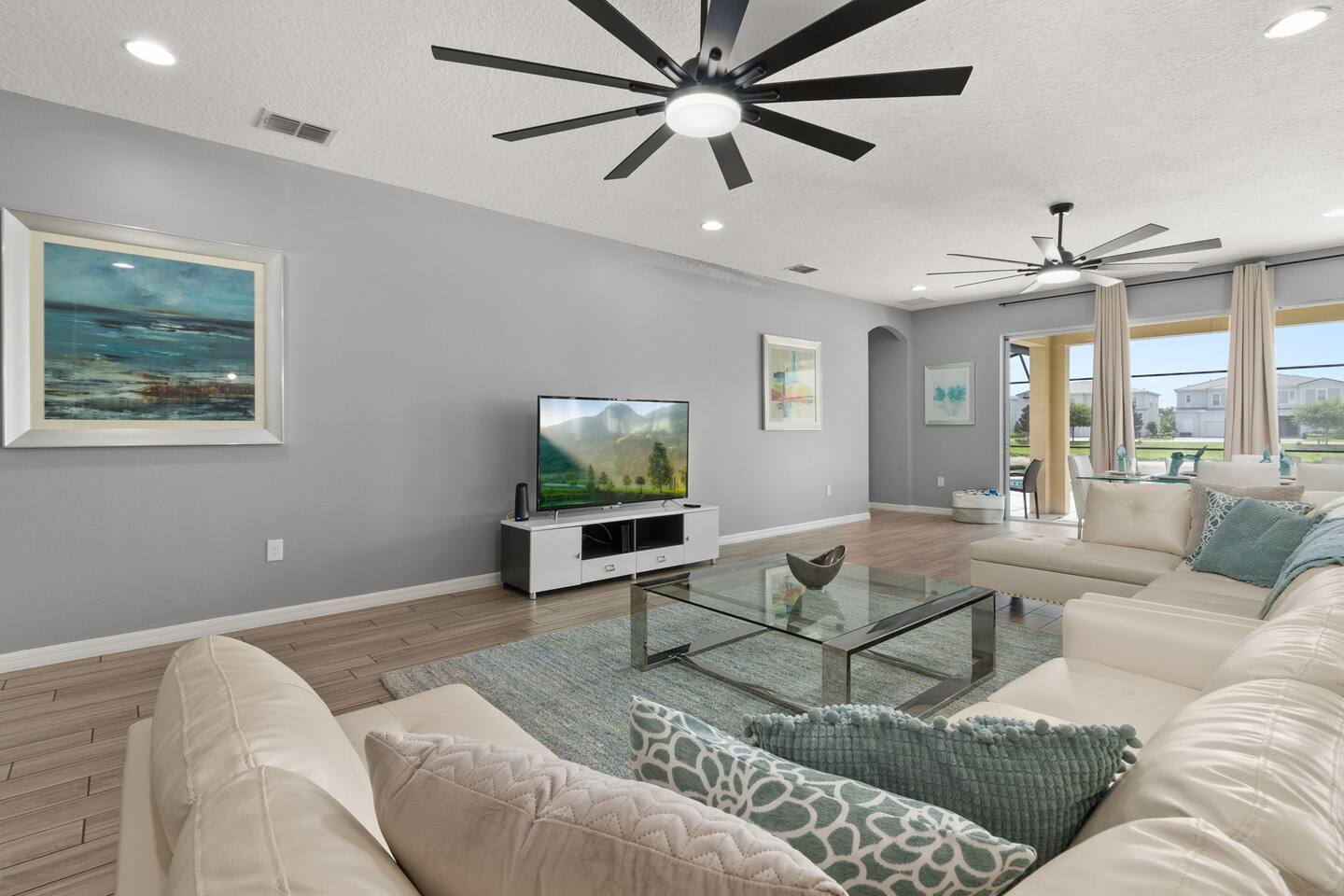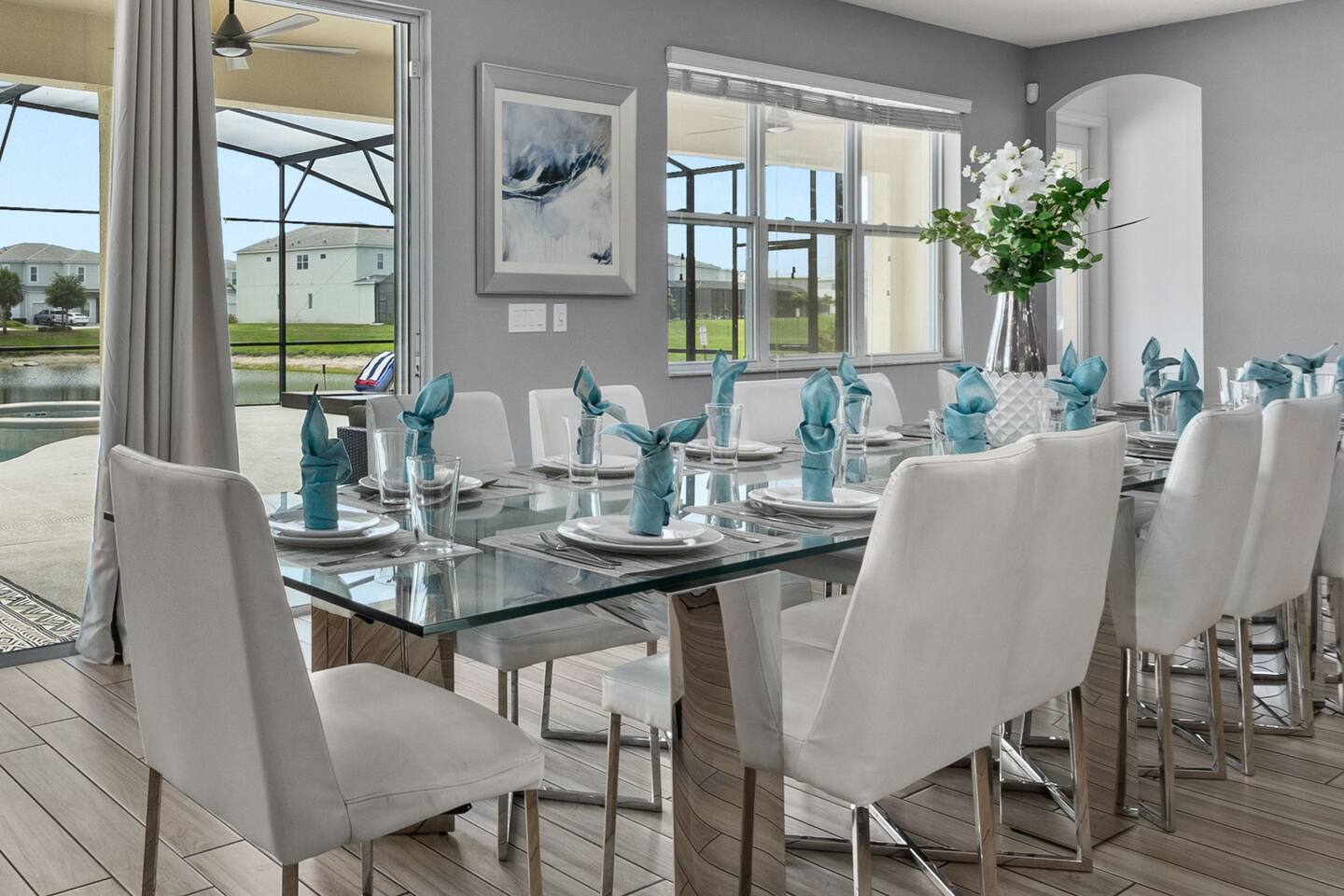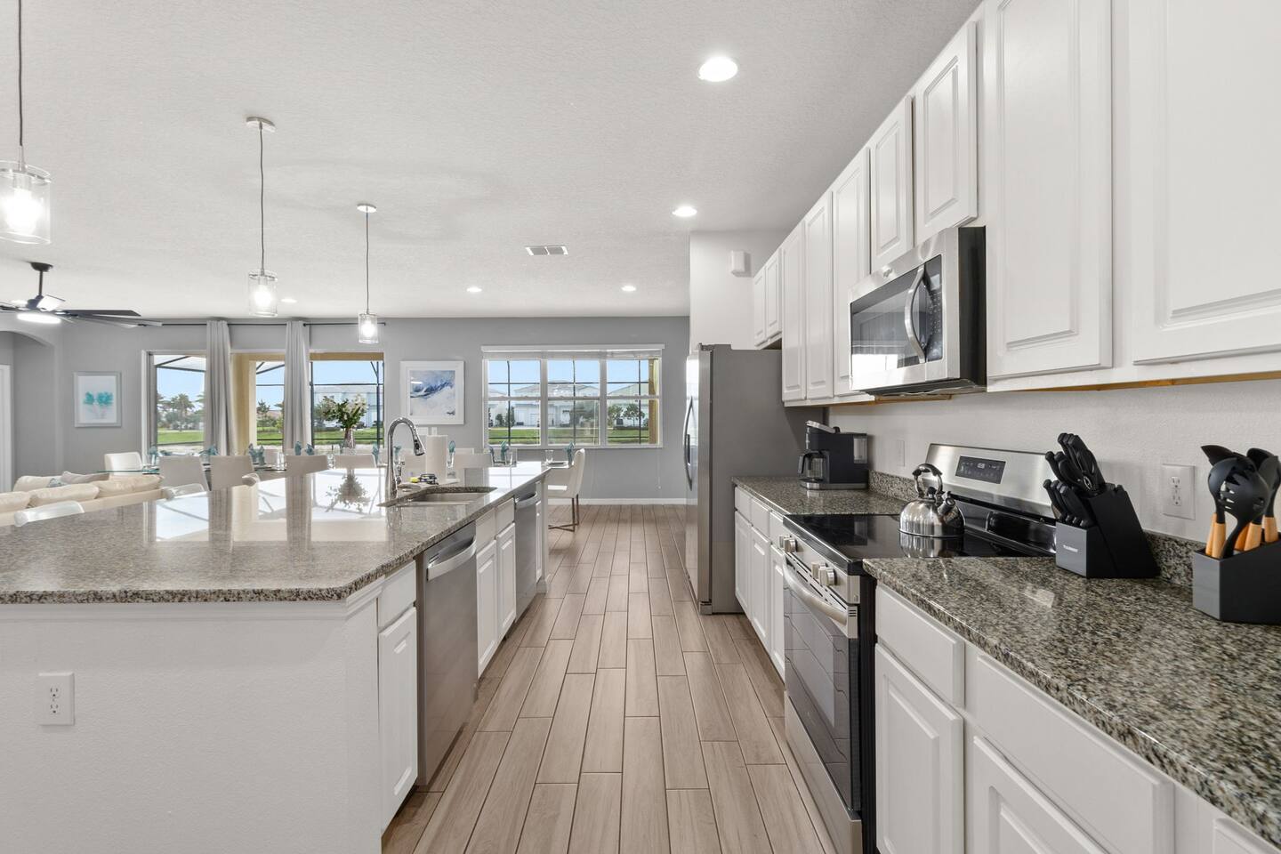 Guests have full access to this spacious and luxurious villa, including the following amenities: - **Private Pool/Spa:** Enjoy a relaxing dip in your screened private pool or unwind in the hot tub, perfect for both day and night use. - **Game Room:** Dive into fun with arcade games, a Wii Switch gaming station, and a tall gaming table for card games. Perfect for all ages! - **Home Theater:** Experience movie nights in style with a 5.1 Dolby Surround Sound system and a 90" Smart 4K TV. - **Entire Home:** Enjoy complete privacy and comfort throughout the 6,200 sq/ft villa, accommodating up to 32 guests. - **Outdoor Spaces:** Make the most of Florida’s sunshine with access to the patio, outdoor dining area, backyard, and sun loungers. - **Solterra Resort Amenities:** Guests can also enjoy full access to all Solterra Resort amenities, including the gym, communal pool, playground, and more, offering additional options for leisure and recreation during your stay. With ample space and numerous amenities, our villa is designed to offer a comfortable, convenient, and memorable experience for all our guests.