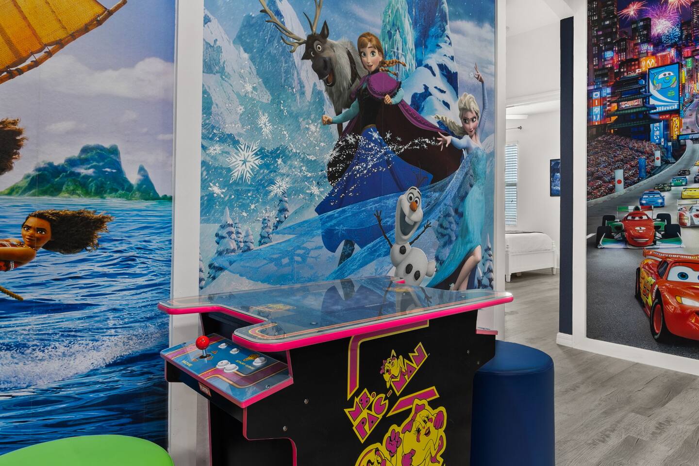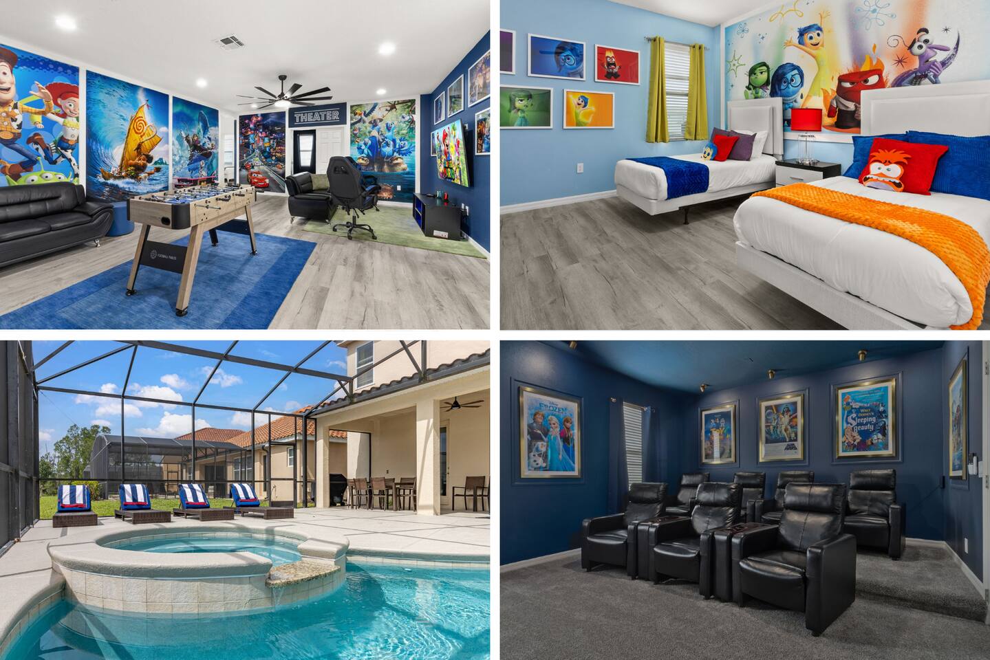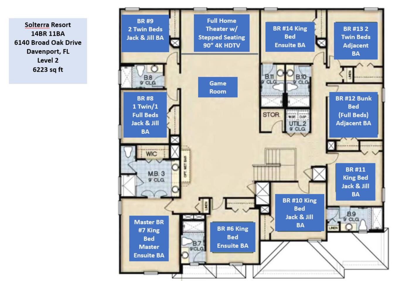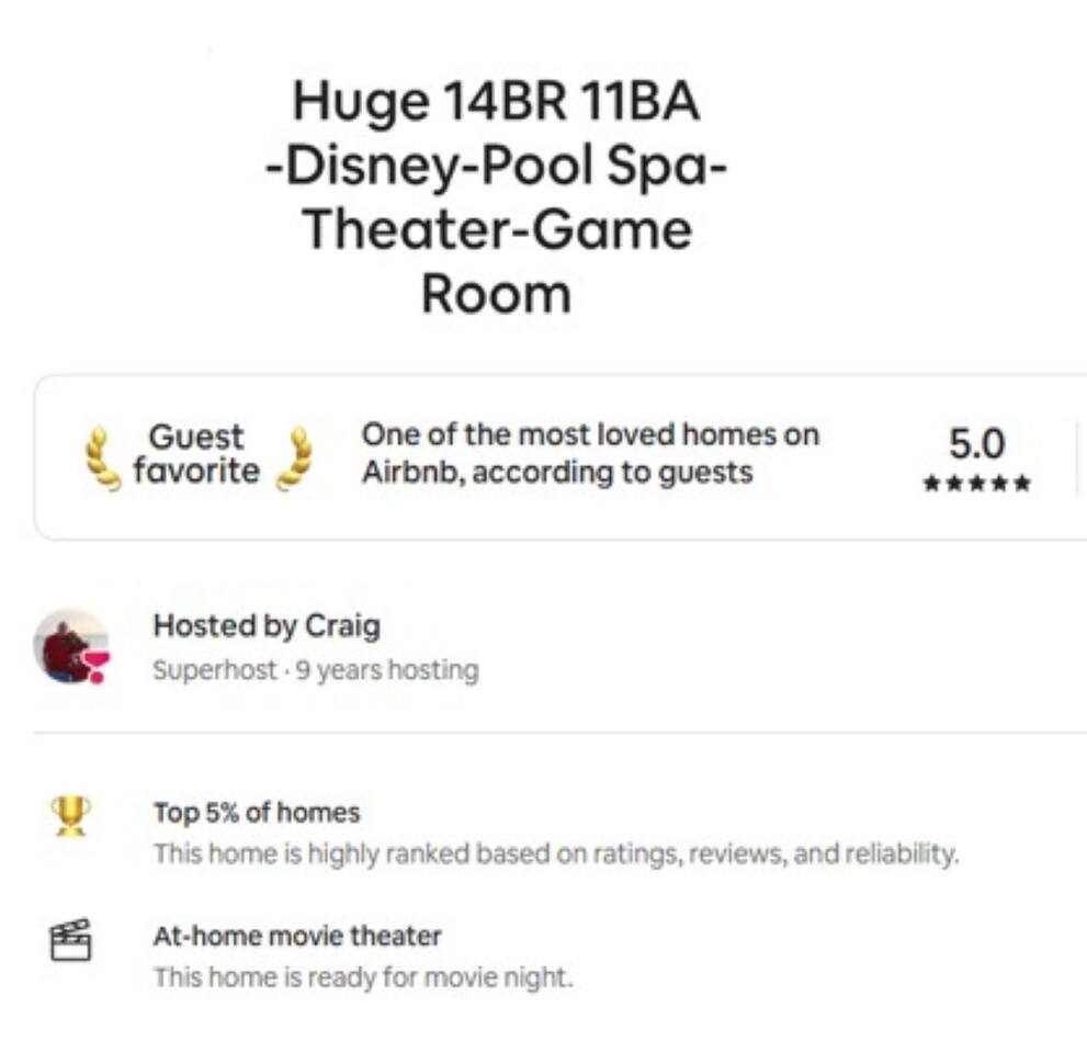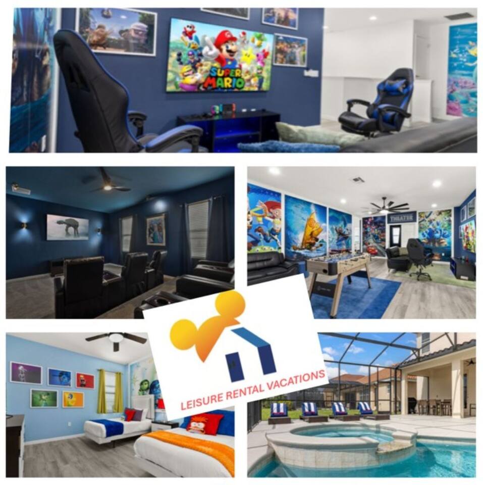 ⭑Master Bedroom:⭑ ✔ Spacious king bed with plush bedding for restful sleep ✔ En-suite spa-style bathroom with soaking tub and walk-in shower ✔ 4K Smart TV, walk-in closet, and room-darkening shades for total comfort ⭑Second Bedroom:⭑ ✔ King bed with high-quality linens and a cozy reading nook ✔ Private en-suite bathroom and Pack 'n Play crib ⭑Third Bedroom:⭑ ✔ Elegant king bed, mosquito net, and generous wardrobe ✔ En-suite with dual sinks and luxurious rainfall shower ⭑Fourth Bedroom:⭑ ✔ King bed with soothing décor and a stylish headboard ✔ Private bathroom with rainfall shower and premium toiletries ⭑Fifth Bedroom:⭑ ✔ King bed with extra pillows and a dedicated writing desk ✔ Sleek en-suite bathroom with a spacious walk-in shower ⭑Sixth Bedroom:⭑ ✔ Second-floor king suite with cozy reading nook and 4K Smart TV ✔ En-suite bathroom with walk-in shower and extra blankets ⭑Seventh Bedroom:⭑ ✔ Vibrant décor with king bed and room-darkening shades ✔ En-suite bathroom featuring a soaking tub and walk-in shower ⭑Eighth Bedroom:⭑ ✔ Twin + full bed combo in a bright, kid-friendly space ✔ Jack and Jill bathroom with bathtub and dual sinks ⭑Ninth Bedroom:⭑ ✔ Two cheerful twin beds and bedside reading lamps ✔ Shares Jack and Jill bathroom—perfect for younger guests ⭑Tenth Bedroom:⭑ ✔ King bed, 4K Smart TV, and dedicated workspace ✔ Shares Jack and Jill bathroom for added convenience ⭑Eleventh Bedroom:⭑ ✔ King bed with cozy reading corner ✔ Shared Jack and Jill bathroom with modern fixtures ⭑Twelfth Bedroom:⭑ ✔ Full-over-full bunk beds in a playful, themed space ✔ Adjacent bathroom with all essentials and kid-friendly design ⭑Thirteenth Bedroom:⭑ ✔ Two twin beds with bright, welcoming decor ✔ Access to shared bathroom with dual sinks ⭑Fourteenth Bedroom:⭑ ✔ Plush king bed with 4K Smart TV and extra closet space ✔ Private en-suite bathroom with modern walk-in shower ⭑Living Room:⭑ ✔ Bright and open space with comfy seating and stylish design ✔ 70” 4K Smart TV, natural light, and easy flow to kitchen and pool ⭑Kitchen and Dining Area:⭑ ✔ Chef’s dream kitchen with double fridges, ovens, and dishwashers ✔ Large island for meal prep and group gatherings ✔ Indoor and outdoor dining tables for memorable meals ⭑Bathrooms:⭑ ✔ 11 stylish bathrooms with shampoo, conditioner, shower gel & more ✔ Hair dryers, fluffy towels, and ample storage throughout ⭑Outdoor Space:⭑ ✔ Private screened-in pool and spa for relaxing any time of day ✔ Lounge chairs, patio dining, and a beautifully landscaped backyard ✔ Access to outdoor resort amenities like playgrounds and fitness center ⭑Additional Amenities:⭑ ✔ Two full laundry rooms with washers and dryers ✔ Baby gear including crib, Pack 'n Play, high chair ✔ Themed kids' rooms, Game Room ⭑Safety and Security:⭑ ✔ Smoke and carbon monoxide detectors ✔ Fire extinguisher and first aid kit included ⭑Entertainment and Connectivity:⭑ ✔ High-speed Wi-Fi and Ethernet ✔ Smart TVs in every room, sound system, game console, and movie theater ✔ Full game room with arcade games and Nintendo Switch ⭑Heating and Cooling:⭑ ✔ Central air conditioning and heating ✔ Ceiling fans and portable fans for personalized comfort ⭑Parking and Facilities:⭑ ✔ Free on-site parking and street parking ✔ Full access to Solterra Resort amenities: gym, pool, clubhouse & more ⭑Services:⭑ ✔ Easy self-check-in with keypad ✔ Luggage drop-off for early or late arrivals ✔ Long-term stays welcome—perfect for work retreats or extended vacations Your stay at Themed Vacation Villa promises luxurious comfort, unforgettable fun, and magical moments for guests of all ages. Book now and elevate your Solterra Resort experience in style! ⭑Conclusion⭑ From the private pool and full-sized game room to the in-home movie theater and spacious dining areas, this villa has everything you need for an unforgettable group getaway. Whether you're planning a family reunion, team retreat, or friends’ escape—reserve your stay today and start your dream vacation!